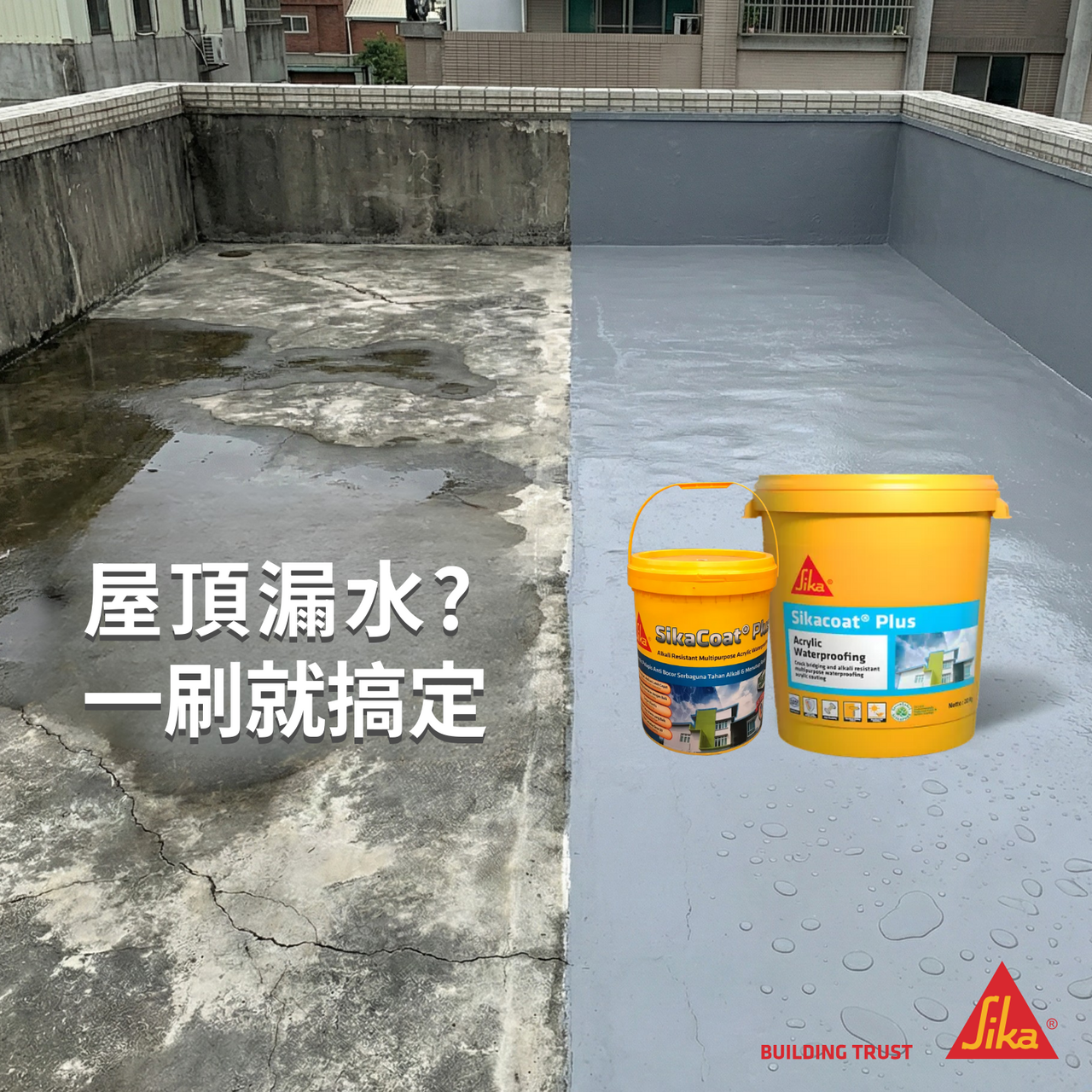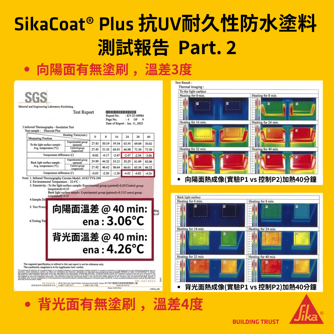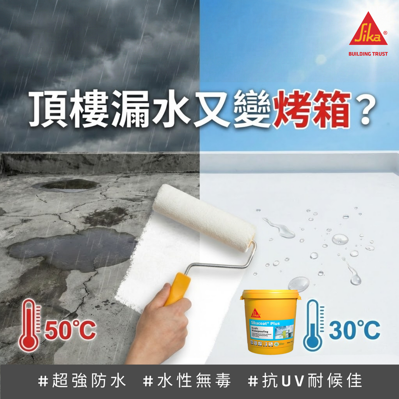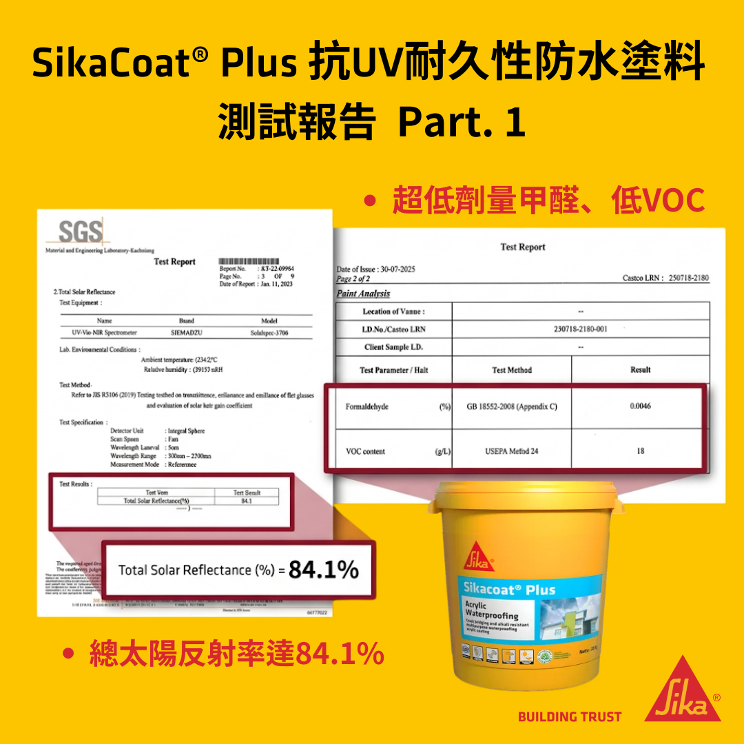 SikaCoat® Plus 是瑞士西卡專為「對抗極端氣候」設計的防水膜。它的彈性像橡皮筋一樣好(延伸率 >400%),就算牆壁熱脹冷縮也能緊緊抓住不裂開。而且「抗紫外線」,曬久了也不會粉掉,是保護透天厝、外牆、女兒牆的最佳雨衣!