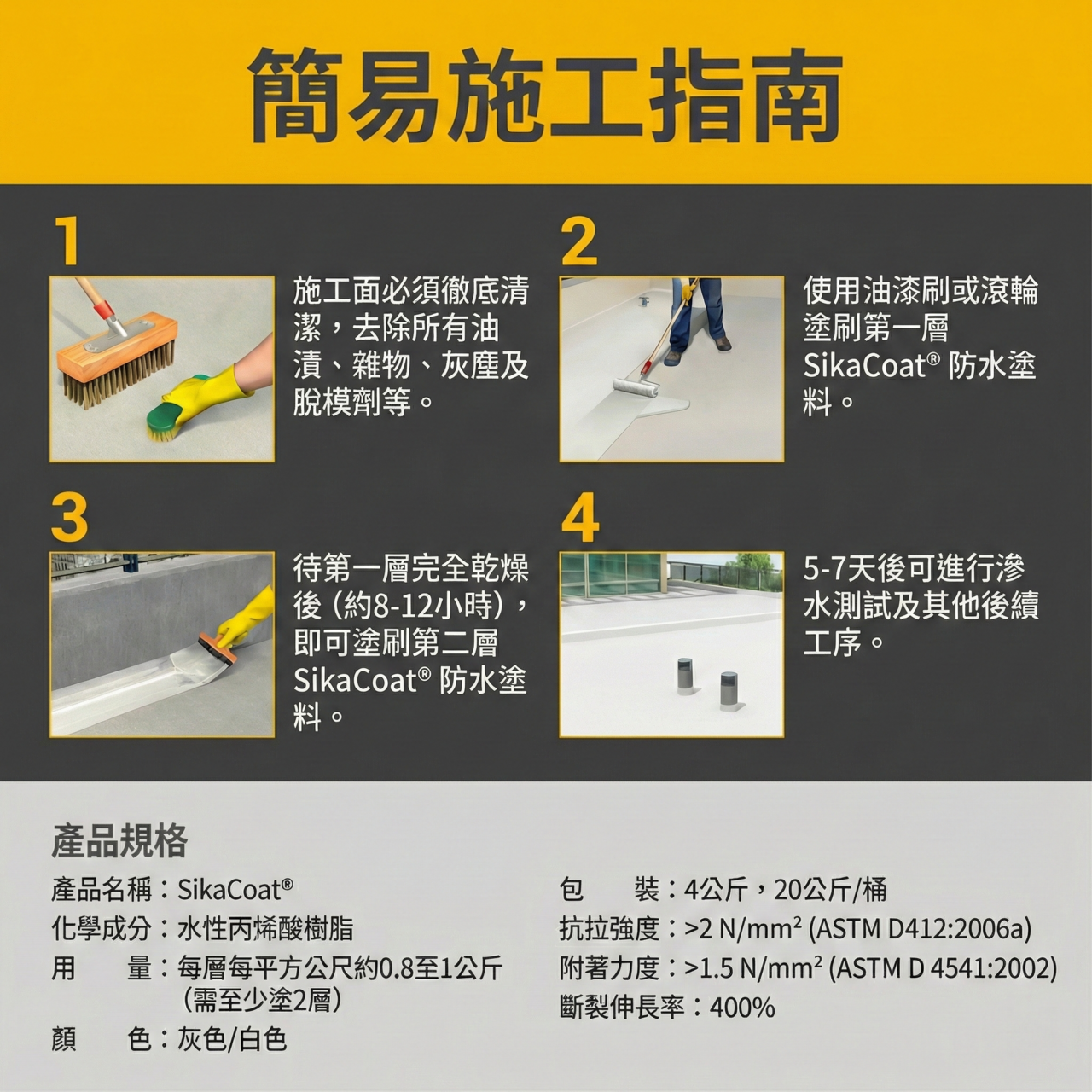 | 塗佈量 | 每層約 0.8~1 kg/m² (底漆 + 建議塗兩層) |